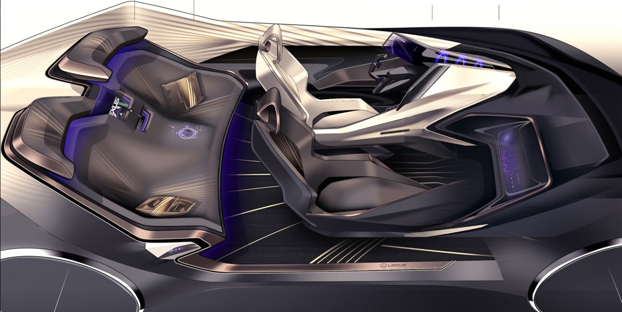 The In-Wheel motors were the starting point to convey power through the body’s form. The Speed Lounge profile shows speed, performance, and amazing space for the rear passengers. Transitional contrast surfacing of the exterior, moving from sensual and fluid at the front, to shear and crystalline at the rear, pushes the definition of L-Finesse, Lexus’s Design Philosophy, to the next era.